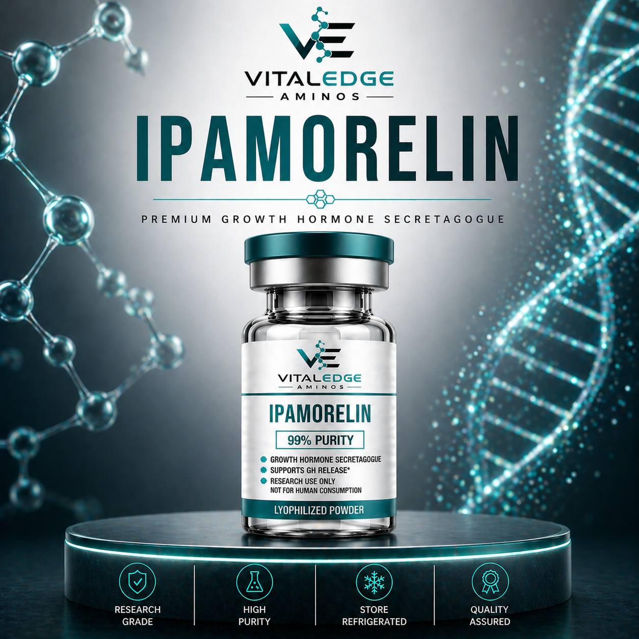 Ipamorelin is a synthetic peptide classified as a growth hormone secretagogue, developed for research into growth hormone regulation, metabolic function, and physiological performance. It is known for its selective stimulation of growth hormone release by mimicking the action of ghrelin without significantly affecting other hormones. In experimental settings, Ipamorelin is studied for its potential to support growth hormone and insulin-like growth factor-1 (IGF-1) pathways, which may influence metabolism, recovery, and body composition. Its selective mechanism makes it a valuable compound in research focused on controlled hormone modulation. Ipamorelin is also of interest in studies related to fat metabolism, recovery processes, and overall endocrine system function, making it a widely researched peptide in laboratory environments.