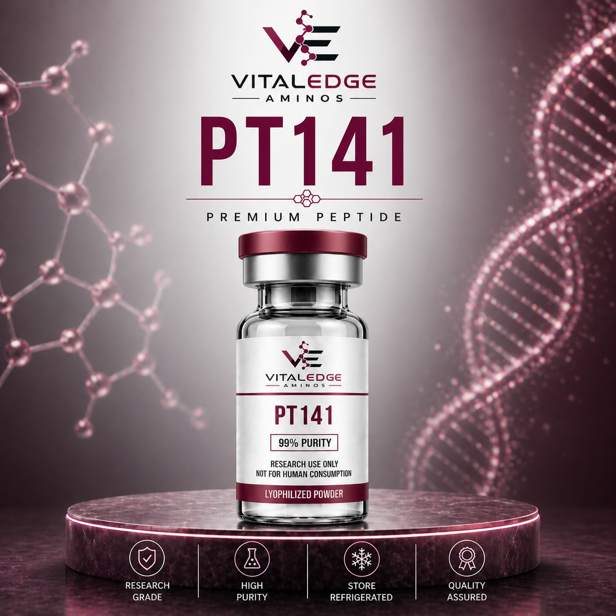 PT-141 is a synthetic peptide analogue of alpha-MSH.   Modern Aminos’ PT-141 peptide is available in 10mg powder vials. Why Choose Modern Aminos? Modern Aminos is the best place to buy peptides online. We are a trusted Research Chemicals vendor with formulations that meet industry standards and comply with quality regulations in Europe, USA, and Canada to ensure product safety and efficiency. If you’re looking to buy research chemicals online, our one-stop-shop offers a wide range of third-party tested, high-quality research chemicals made in the USA — including top-tier peptidesnootropicsamino acidsresearch oilsliquid research compounds, and more! Our products are routinely and rigorously tested for purity, with COAs verifiable through third-party laboratory testing services. We also maintain reliable customer services to facilitate smooth consumer experience from pre-sale inquiries to after sales concerns. For questions about our products, you may contact us through any the following email addresses: USA – cs@modernaminos.com Europe – support@modernaminos.eu           Modern Aminos shall not be held liable for injuries or damages resulting from the handling or use of our products. If you do not agree with these conditions, we advise  you not to proceed with the purchase of any research compounds from our company.